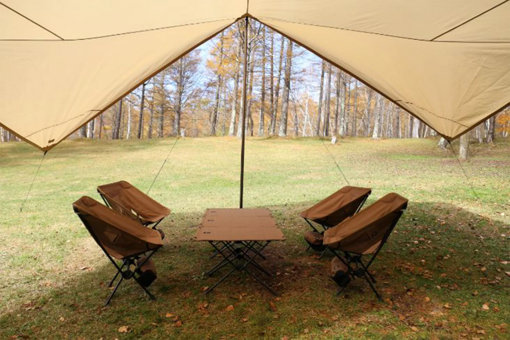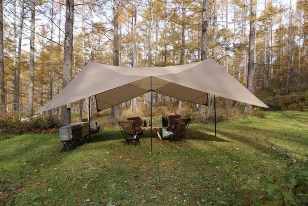 四边对角的搭建方式可以更靠近地面,使天幕下形成更多阴影面积,可减少雨水淋入。同时也可以让雨水随着四个方向顺势流下,减少因雨水累积在缝隙中而造成渗透的情况。