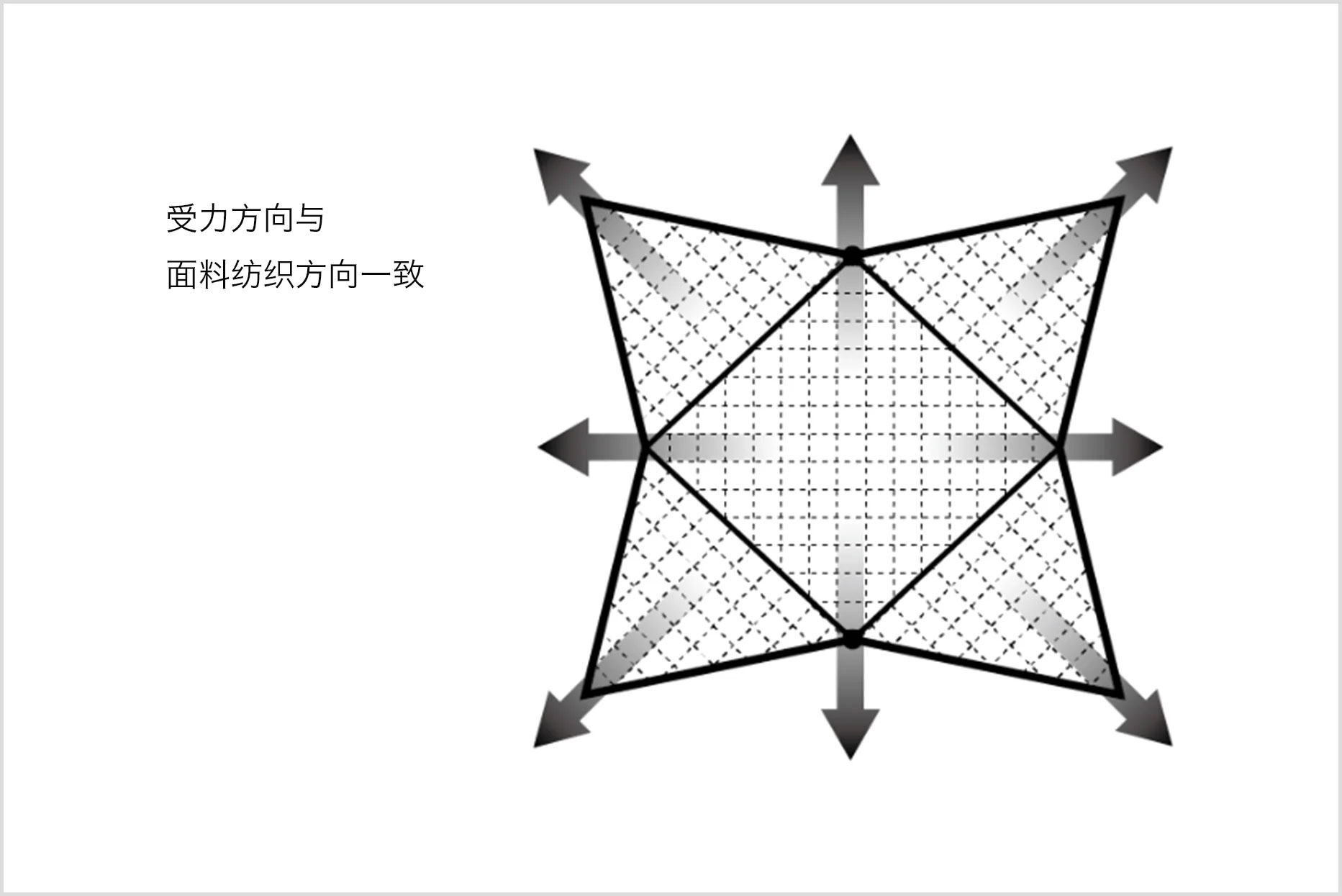 为了方便轻松搭建出具有美感形状的天幕,面料材质的四角纹理分布顺着受力方向缝制,极大的抑制了斜向裁剪带来的受力不均的情况。