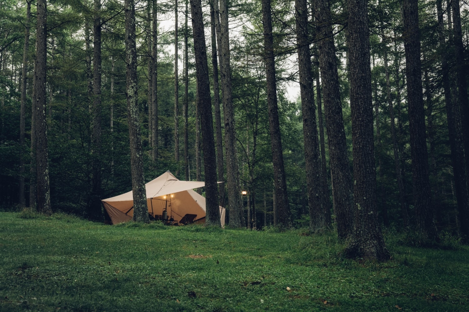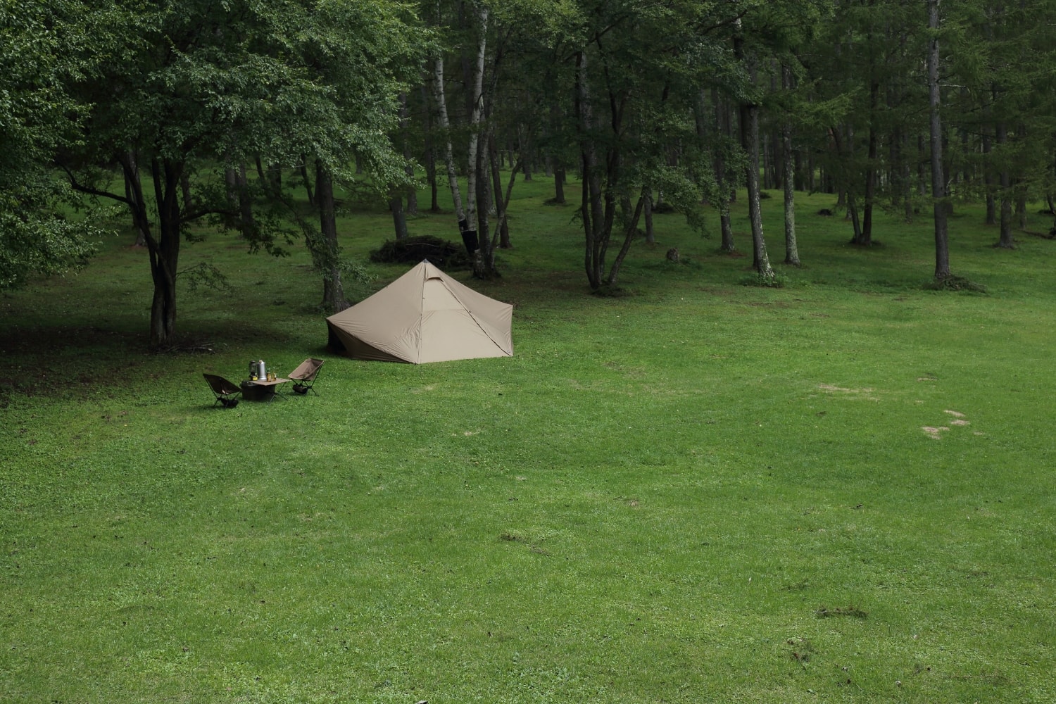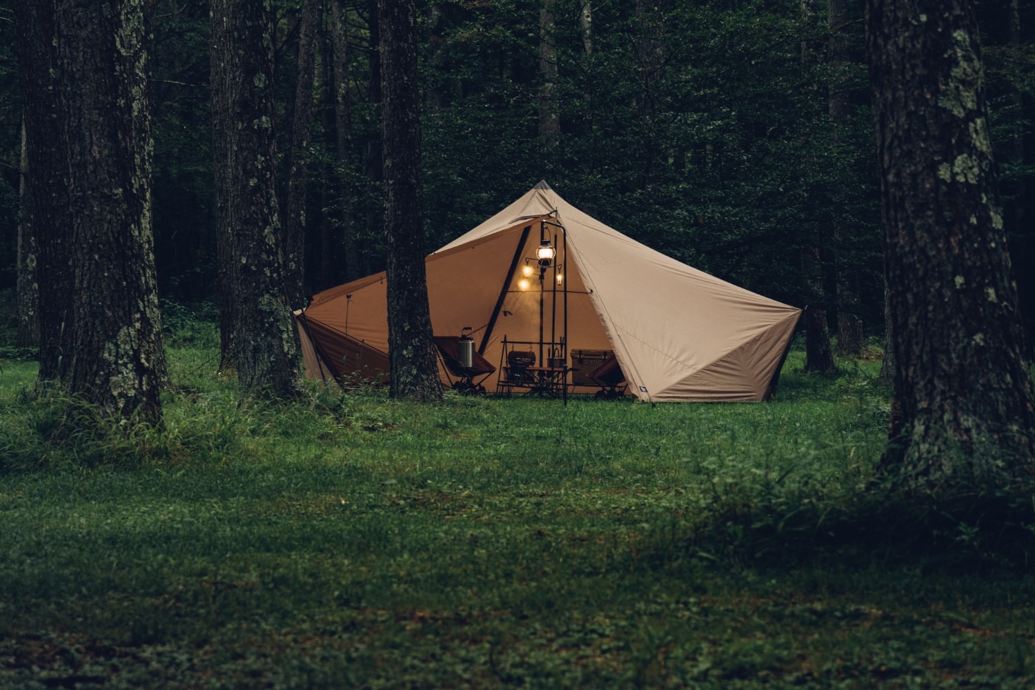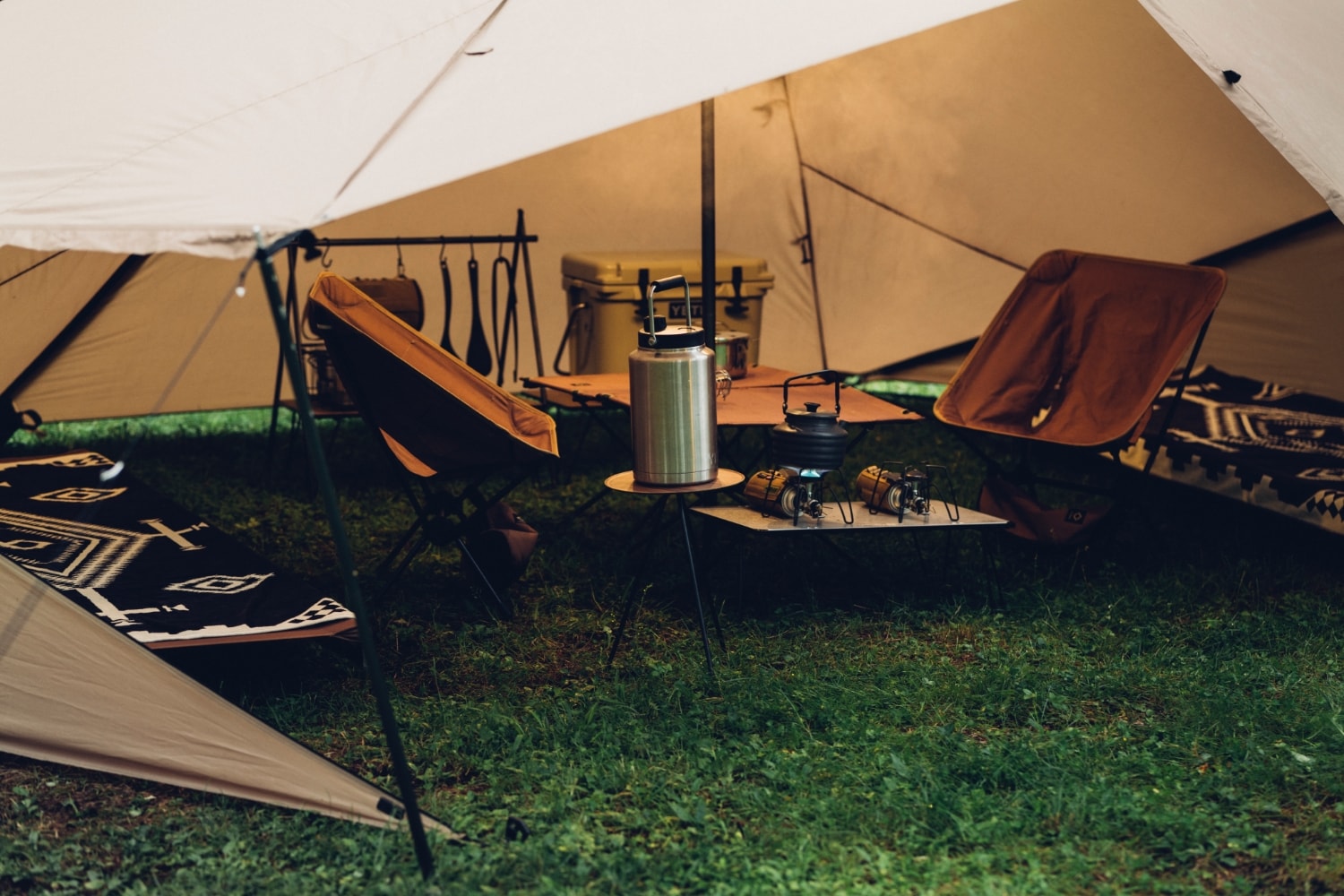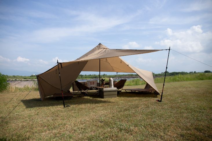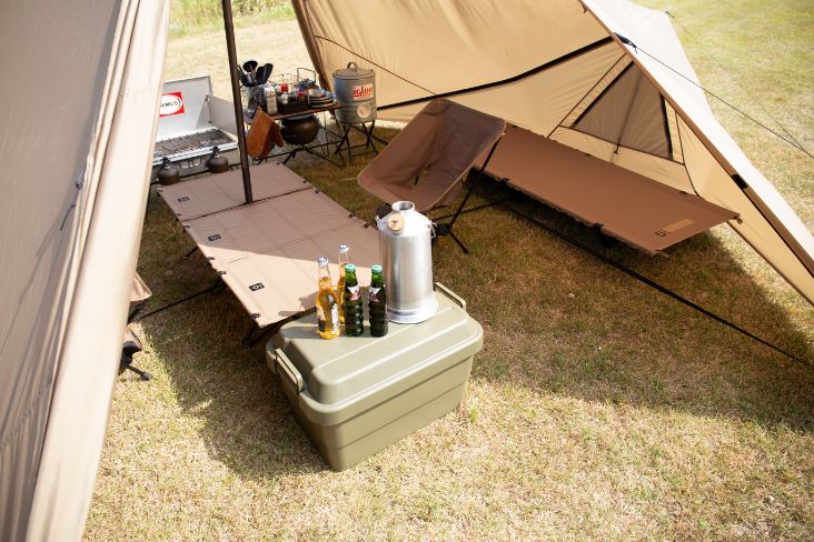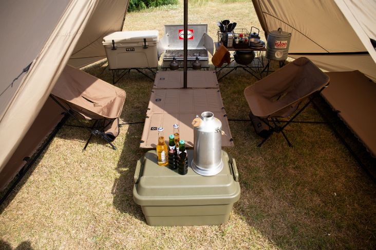 在放置双人露营用的桌椅等装备后,仍有充足的空间来放置两张行军床。空间利用方式灵活,是一款兼具休闲与休息功能的小型帐。