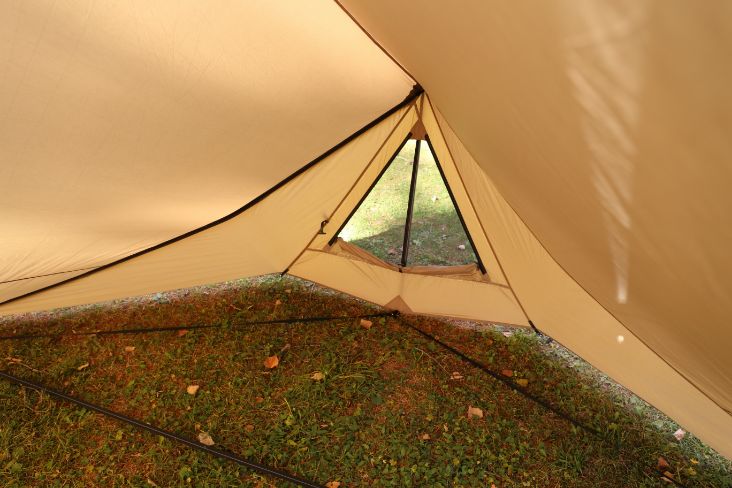前后门厅帘均可以用支撑杆(另售)撑起,扩展空间的同时带来天幕般的开放感,物理性解决了单杆帐夏季闷热的缺点。