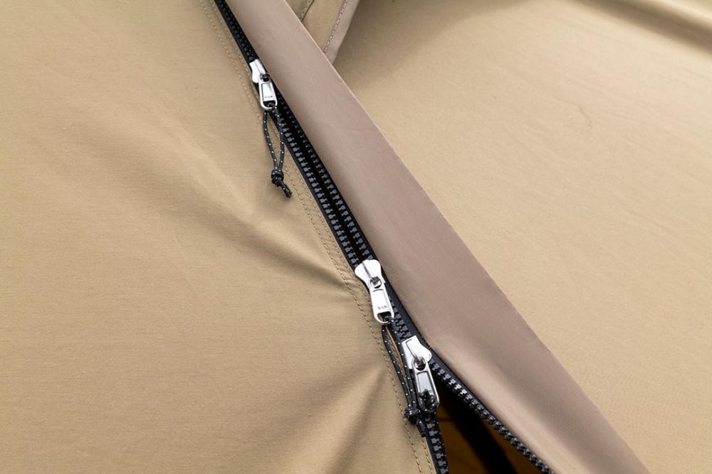 主出入口处的拉链上配有三颗拉链头。通过拉链头可以随意调整开口位置,方便帐内物品摆放设计。
