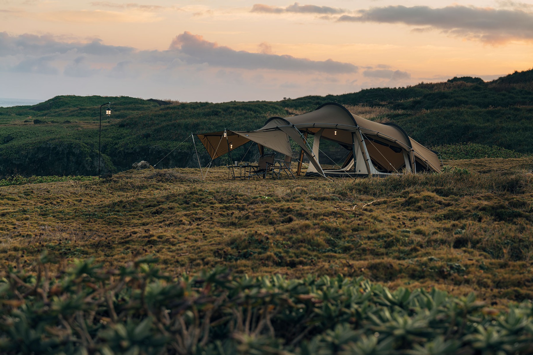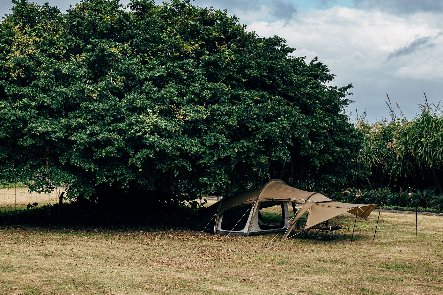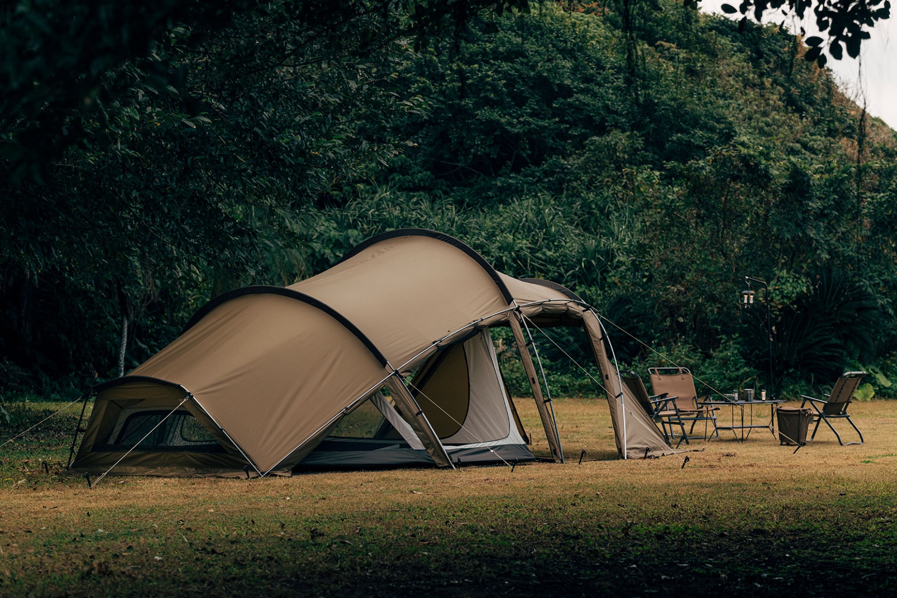 前厅及侧门均可打开,根据营地气温与风向可以随意调整室内温度。另外,将所有门帘都打开时,足不出帐即可欣赏到外面美景,十足的开放感令人心情愉悦。