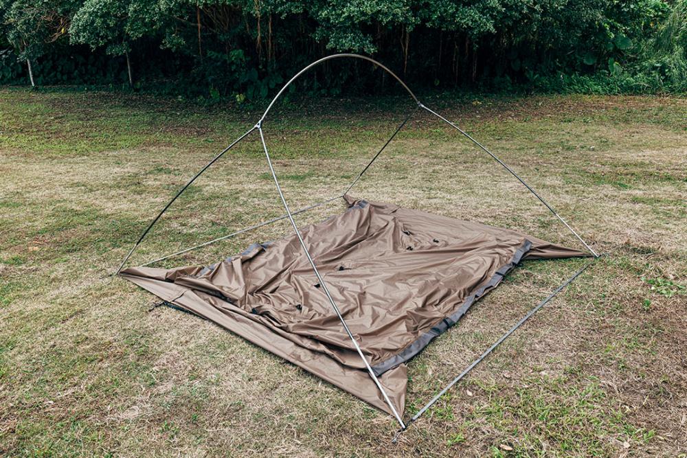 帐篷搭建困难的原因之一在于要用纤弱的帐杆来支撑起沉重的篷布。本产品的特点为先使框架支撑起来,然后用挂钩来设置篷布,以此减轻搭建难度。
