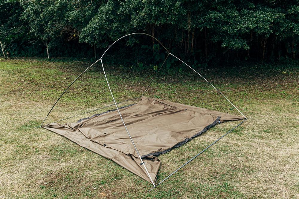 帐篷搭建困难的原因之一在于要用纤弱的帐杆来支撑起沉重的篷布。本产品的特点为先使框架支撑起来,然后用挂钩来设置篷布,以此减轻搭建难度。