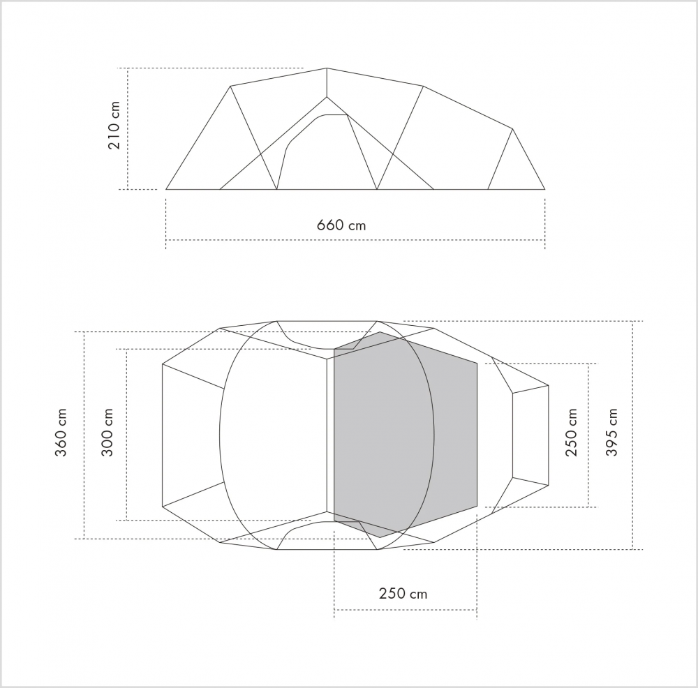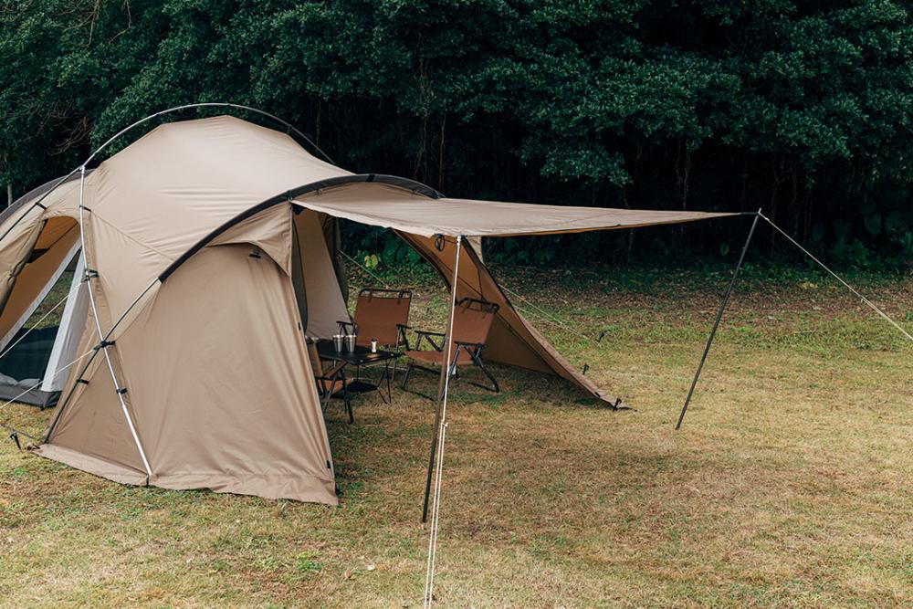 前厅部分的门帘可以向外延伸式撑开(需另配支撑杆及风绳)。从裙角处撑起的设计,使搭建后的整体造型简洁美观。