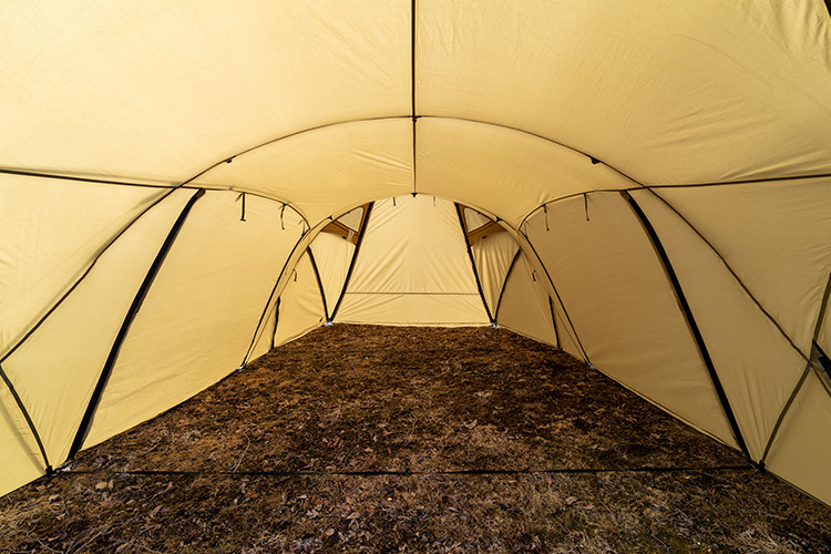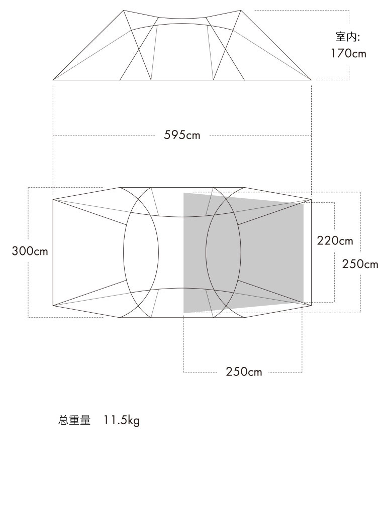 帐内两处最高点可达170cm。兼具抗风性与宜居性双重效果的中型一室一厅帐。若撤除内帐,也可以作为大型客厅帐来使用。