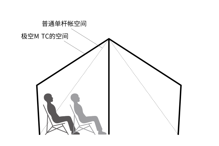 单杆帐最大的缺点是可利用空间小,所以侧面拓展框架的设计极大地解决了这一问题。虽然帐底面积为中等型号大小,但是空间利用率堪比普通的大型单杆帐。