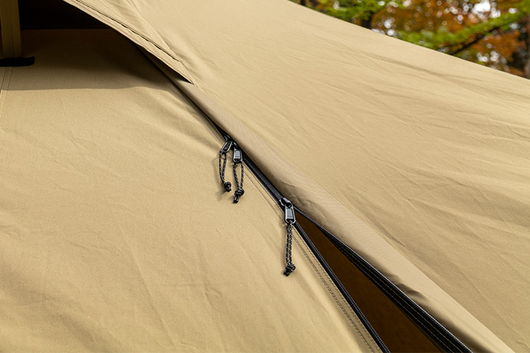 主出入口处的拉链上配有三颗拉链头。通过拉链头可以随意调整开口位置,方便帐内物品摆放设计。